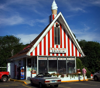 The Red Rooster Drive-In in Brewster, New York is old-school chocolate dipped soft-serve dispensed from a building with a slightly swoopy, high-pitched roof, candy-striped pediment, and an ice cream shaped cupola–just what’s needed to catch your eye as you drive along N.Y. 22.